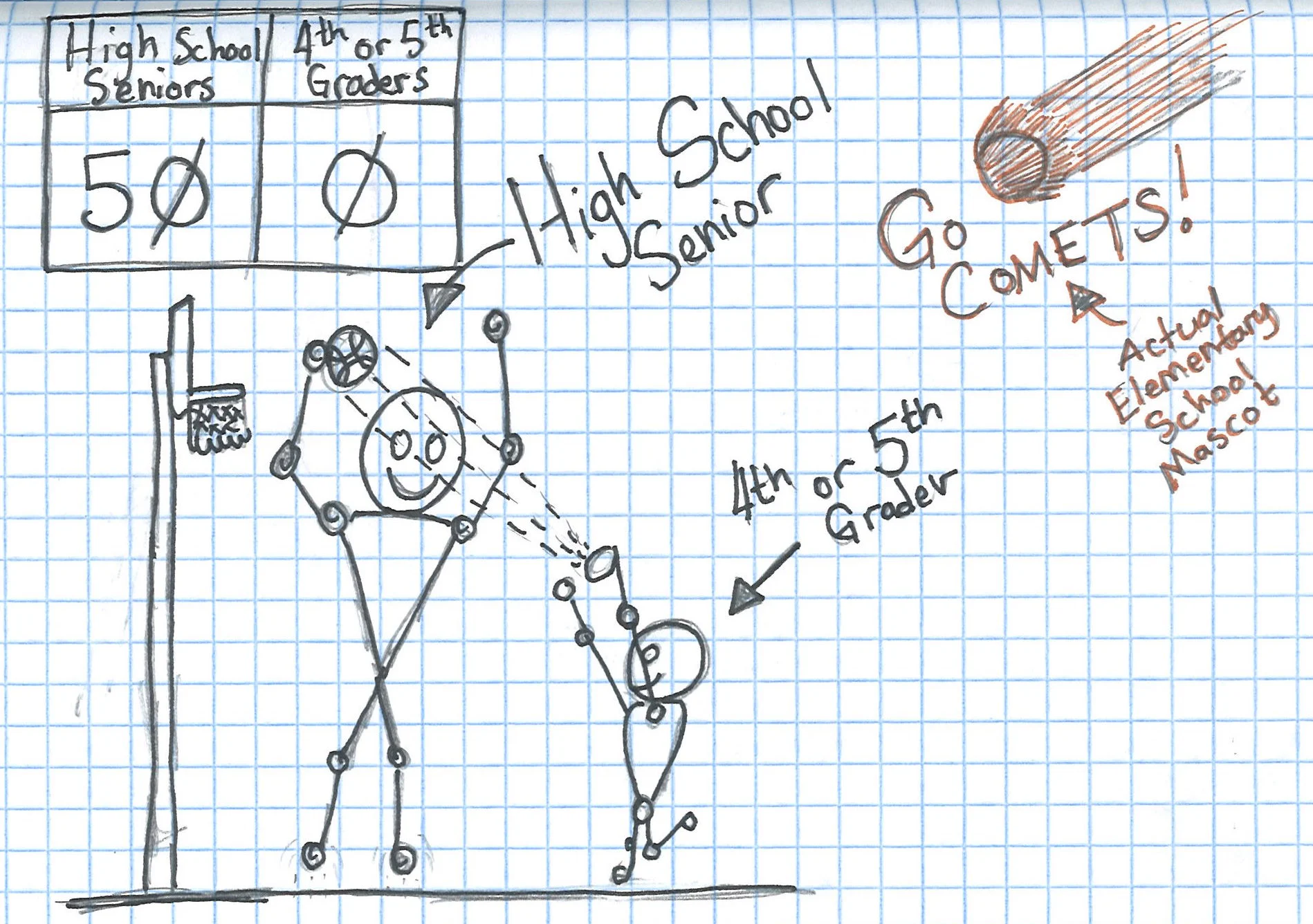 My group of friends decided to play a game of basketball with our pen pals. It seemed only fair that it should be us (the legal adults) vs. them (mostly 4th or 5th graders). The elementary students seemed amenable, and since none of us high schoolers were very sports inclined, we thought the shorter basketball hoops would really help us out.